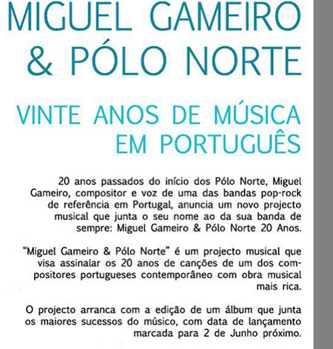 Dezoito anos depois de formar os Pólo Norte, Miguel Gameiro lança o seu disco de estreia a solo, "A Porta ao Lado": um sucesso inquestionável que tem firmado presença nos lugares cimeiros do top nacional de vendas. “Embora mude de casa, a música será sempre o meu bairro” afirma Miguel Gameiro, para relembrar que os Pólo Norte fizeram e fazem parte da sua carreira. Neste momento, Miguel aposta no seu primeiro trabalho a solo produzido por Paulo Borges (Rita Red Shoes, (...)
