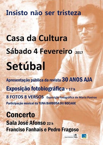 Sábado | 4 de Fevereiro | Casa da Cultura de Setúbal Apresentação pública da Revista AJA 30 ANOS - Galeria de Exposições, 17h00 Exposição fotográfica 8 FOTOS 8 VERSOS de Maria Poeiras Participação musical da Tuna Barbosa du Bocage Concerto com Francisco Fanhais e Pedro Fragoso – Sala José Afonso, 22h00