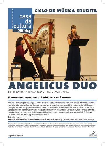17 de Fevereiro | sexta-feira | 21h30 | Sala José Afonso Ciclo de Música Erudita ANGELICUS DUO Soprano e Harpa A Música é a linguagem dos anjos…. A voz entrelaça-se suavemente no delicado som da Harpa, resultando numa junção harmoniosa de timbres, num concerto angelical com repertório instrumental e litúrgico de Vivaldi, Händel, Mozart e Schubert, entre outros nomes da música clássica. Colegas desde os tempos de estudantes na Escola de Música do (...)