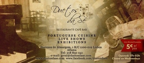 DUETOS DA SÉ Restaurante Café Bar ALFAMA – LISBOA PORTUGAL "Onde a arte e a gastronomia se encontram" GASTRONOMIA & MÚSICA GASTRONOMY & LIVE MUSIC AGENDA DE CONCERTOS DE FEVEREIRO 2017 Domingo & Segunda-feira - CONCERTOS "IN FADO" – 21h30 Terça-feira - CONCERTOS "ALFAMA JAZZ" - 21h30 Quinta-feira - CONCERTOS - 21h30 Sexta-feira & Sábado - CONCERTOS - 22h00 PROGRAMAÇÃO DE CONCERTOS INTIMISTAS À SOBREMESA PROGRAM OF INTIMATE LIVE CONCERTS (...)